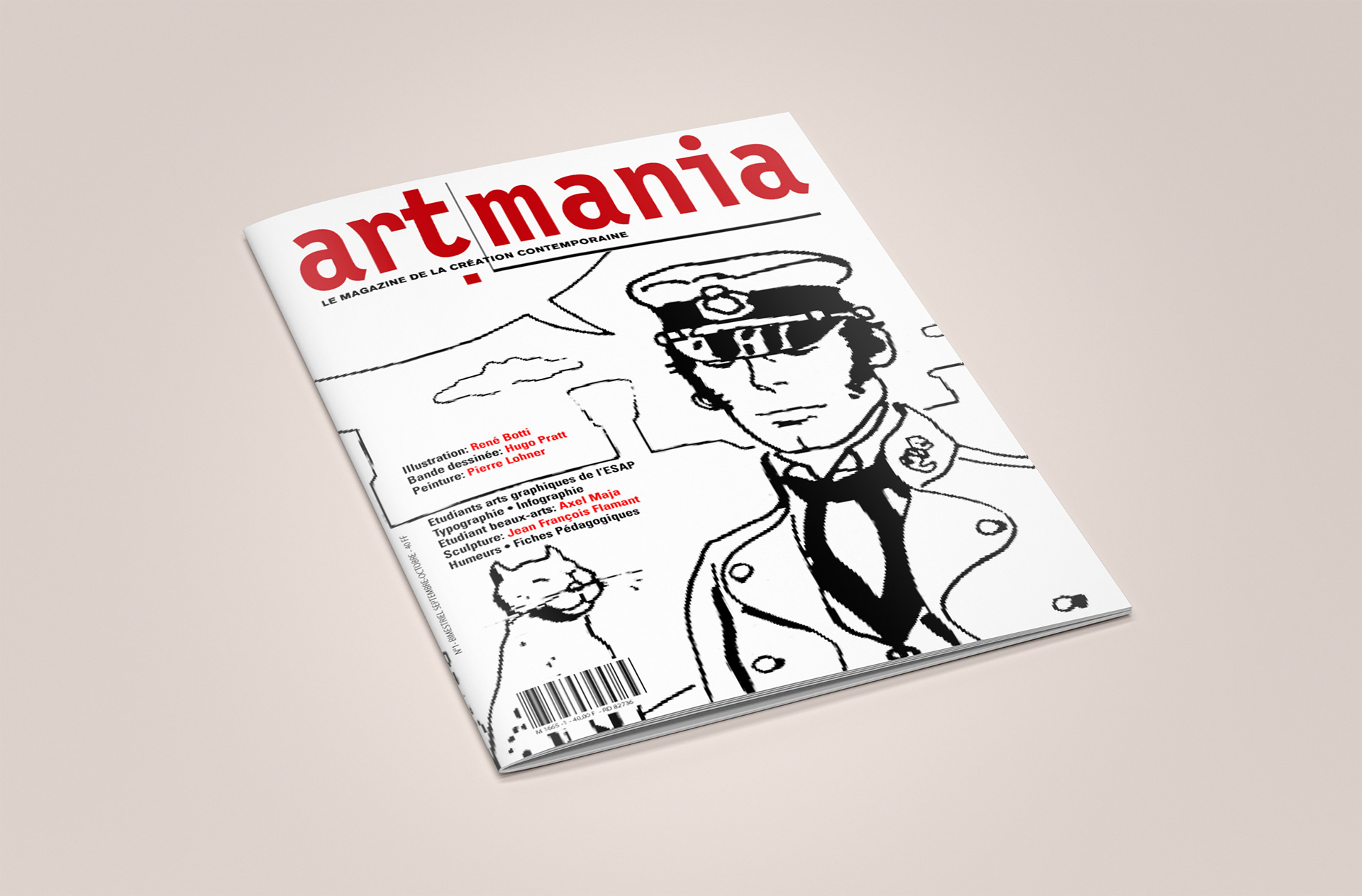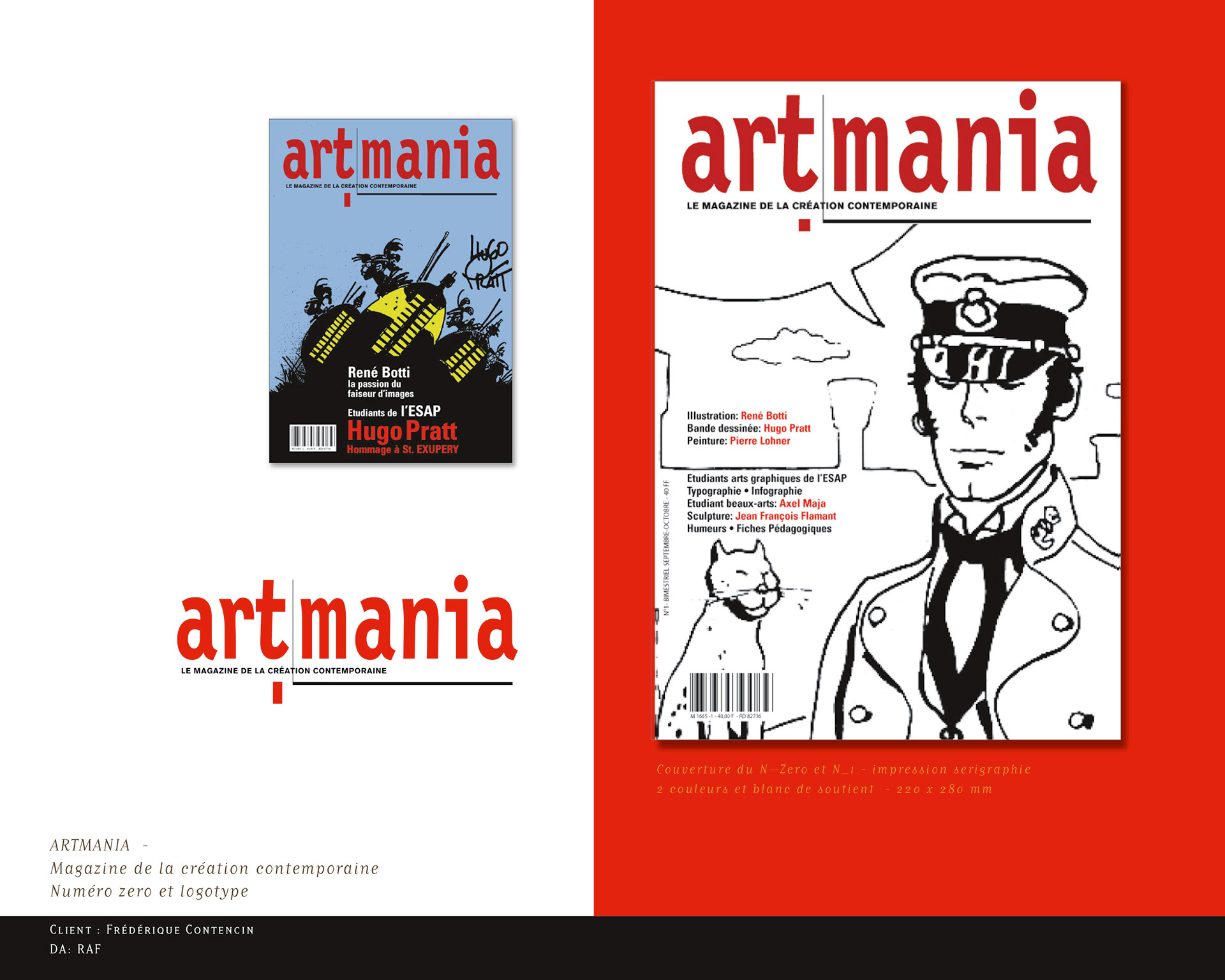 Magazine de la création contemporaine Logotype Artmania, Mise en page numéro zéro et N°1 Spécial Hugo Pratt Directrice de la publication Frédérique Contencin